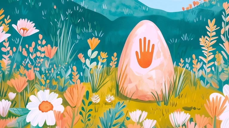 This design features a serene mountain landscape and a vibrant field of flowers, symbolizing a journey and the peaceful feeling of coming home to yourself.