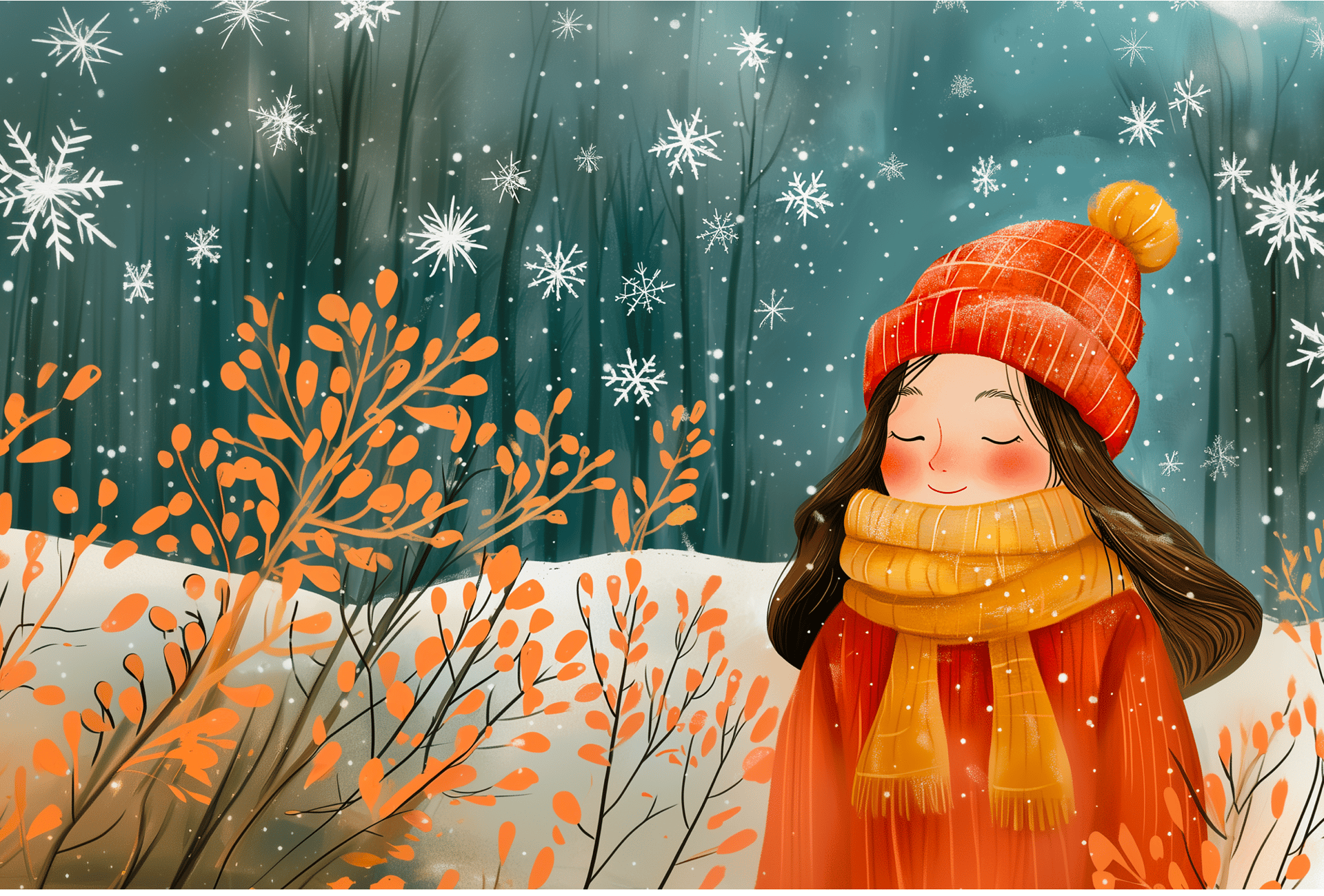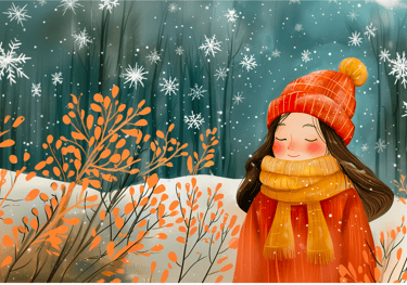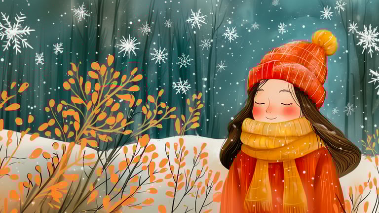 Close your eyes and feel the peaceful stillness of a snowy forest. You are walking through the woods, wrapped snugly in a warm knit hat and scarf, feeling the gentle snowflakes drift down around you. The vivid splash of golden winter foliage contrasts beautifully with the serene, dark pines, making this a moment of pure, quiet joy.