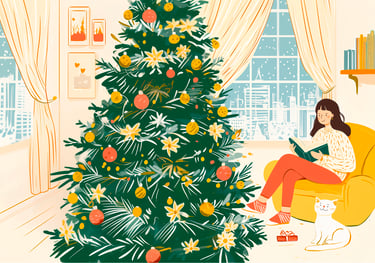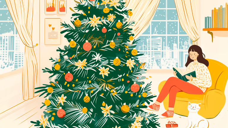Close your eyes and breathe in the quiet magic. You are settled by the window, the glow of the ornate Christmas tree casting a soft light as snowflakes drift down outside. Your white cat is curled at your feet.