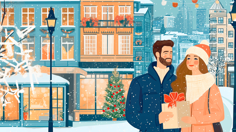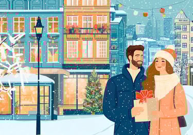 Imagine strolling hand-in-hand through a charming, snow-kissed town, the air sparkling with Christmas lights and gentle snowflakes. You've just received a beautifully wrapped gift, and a warm smile touches your lips as you admire the festive window displays and the twinkling tree in the distance.