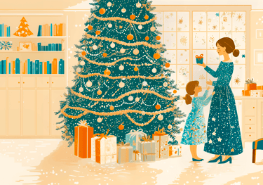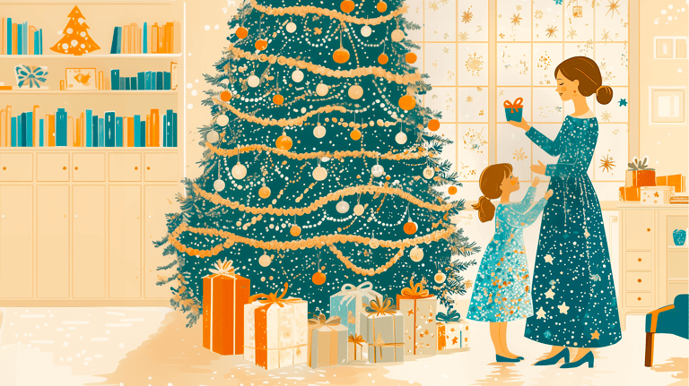 Wake up to the magic of Christmas morning, where everything feels bathed in golden light. You are standing beside a magnificent, fully decorated tree, the air thick with anticipation as you share a beautifully wrapped gift with your little one.