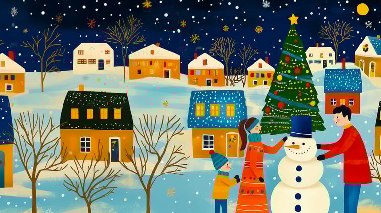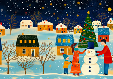 Imagine stepping outside into a serene, snow-covered village, the sky ablaze with a blanket of golden, glittering stars. You are bundled up with your family, the crisp air filled with the gentle laughter of building a festive snowman right beside the community Christmas tree.