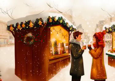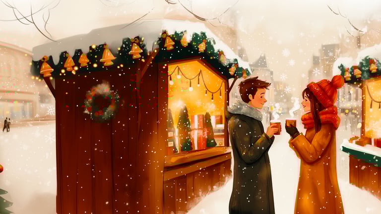 Feel the intimate moment of a winter date at a bustling holiday market. You are standing under the gentle snowfall, the golden light of the market stall illuminating your faces as you share a warm drink and a quiet, meaningful glance.